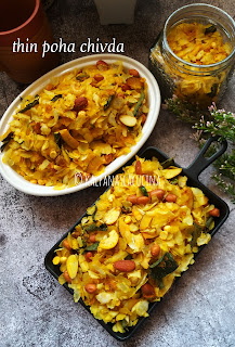 The type of poha used for fried and roasted chivda is another significant distinction. The thicker type of poha should be used for frying, while the thin variety should be used for roasting. This chivda is always made with the intent of storing it for a minimum of 2-3 weeks and hence, we add ingredients that will not go bad at room temperature for that duration. This poha chivda is also gluten-free and vegan. As this chivda has a lot of good ingredients (peanuts, sesame seeds, roasted gram dal), and is relatively light, it is also often called diet poha chivda. This chivda is made with only 2 tablespoon oil and hence it's a healthier option for the people who wants a low calorie afternoon snack with tea. Not only that but it takes hardly 15-20 minutes and stays good for upto 2-3 weeks.